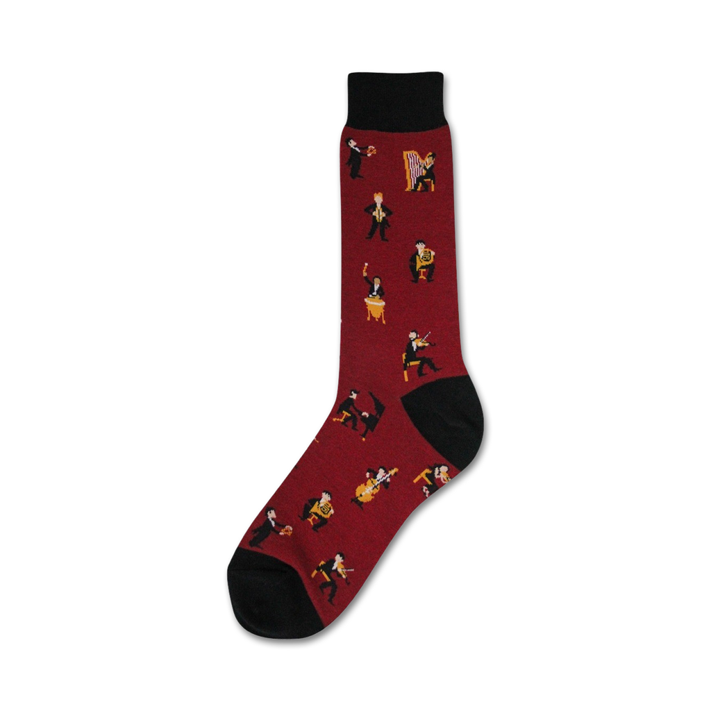 Put some pep in your step with our Symphony socks! These red, crew-length socks are covered in cartoonish musicians playing their hearts out on various instruments. Perfect for the music lover in your life, these socks will have you toe-tapping and head-bopping all day long. Plus, they're guaranteed to put a smile on anyone's face you meet.