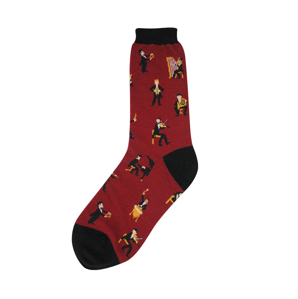 Meet Symphony: crew socks in a rich burgundy red. They're covered in a repeating pattern of musicians playing various instruments - tiny pixelated figures bringing the joy of a full orchestra to your feet. The visible portion shows musicians playing the harp, piano, violin, and what looks like a drum. The black toe and heel add a nice contrast to the overall design. These socks are a fun way to add a little musical flair to your everyday outfit.