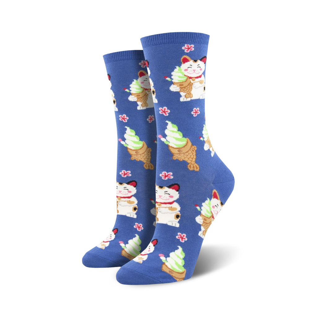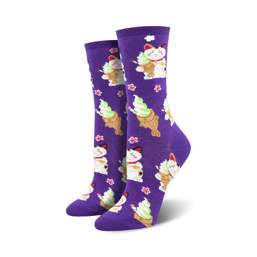 Meow-tastic Adventure: Dive into a vibrant, cute, and cool world with Taiyaki Cat Socks! Featuring an adorable purple canvas of cartoon cats, irresistible ice cream, and tempting fish-shaped waffles, these crew-length socks are perfect for women with a playful paw-sitivity. Slip into these charpurr-ming socks and unleash your inner feline finesse!
