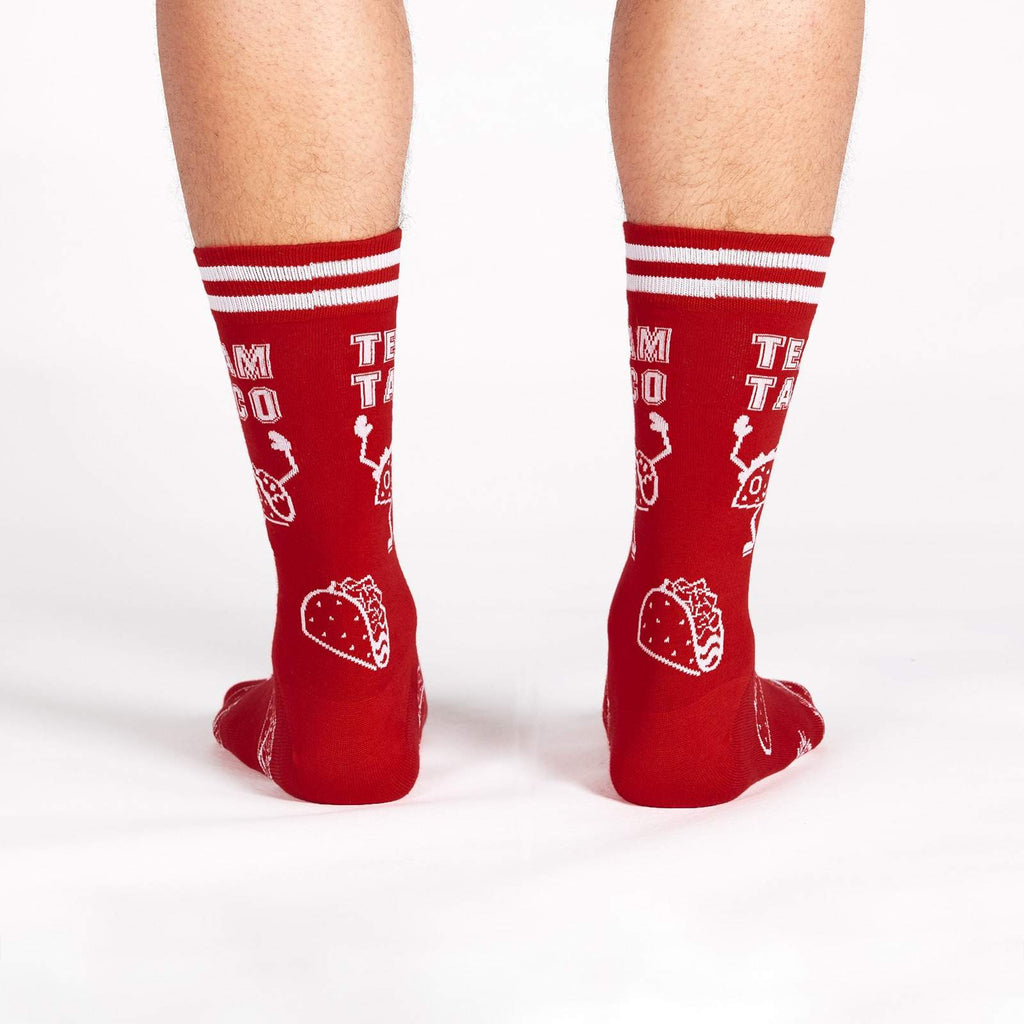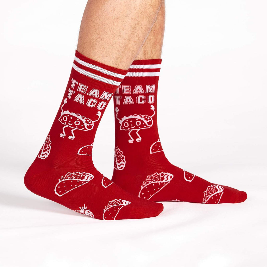 Show your love for tacos with these fun 'Team Taco' socks! They're a vibrant red with a playful pattern of happy little tacos and the words 'Team Taco' near the top. The socks shown have white stripes near the cuff. These are crew socks, as visible in the images. They're perfect for adding a little spice to your everyday outfit. Get ready for some serious taco-themed foot fashion.