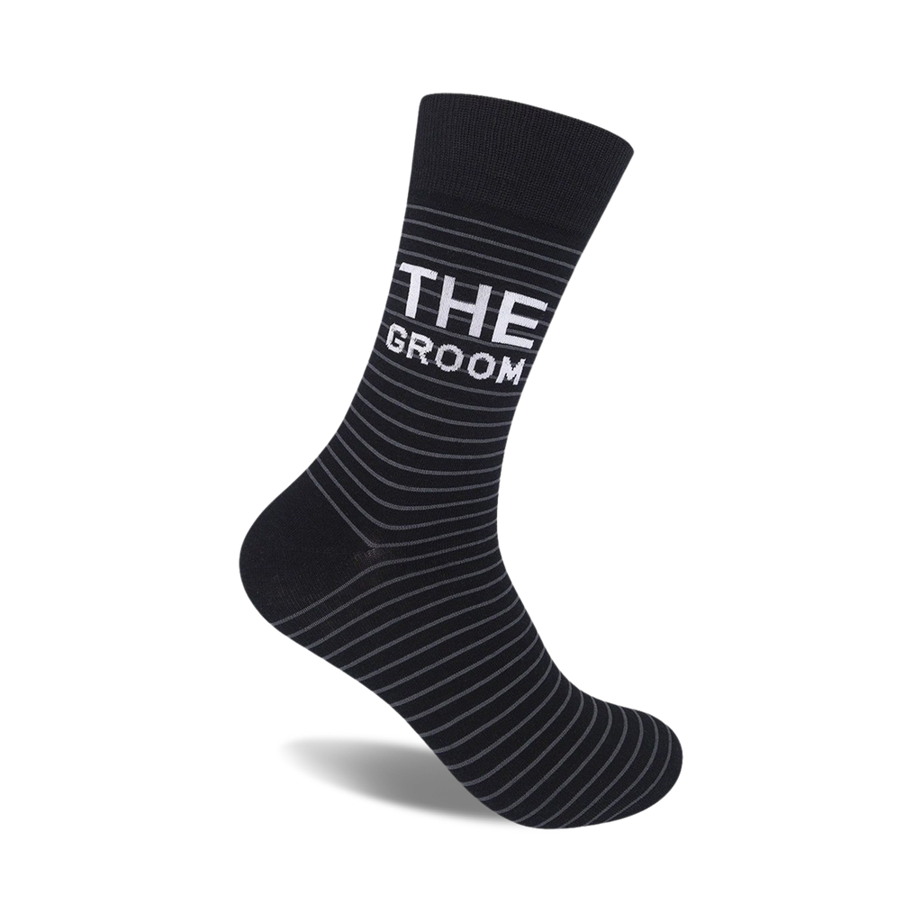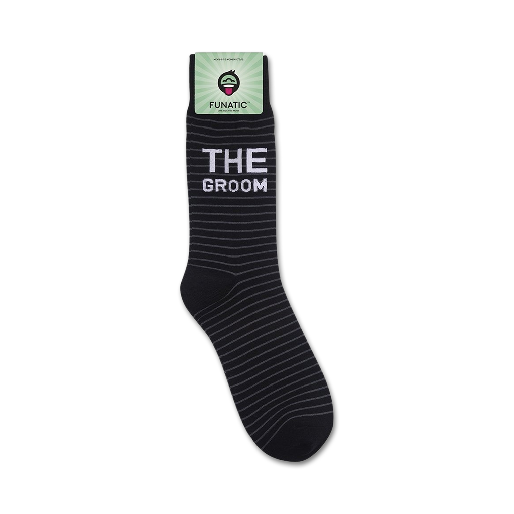 "Slip into matrimonial bliss with our dashing 'The Groom' socks! Adorned with gray stripes, these bad boys proclaim your special day status in bold white letters. Show off your individuality and commitment in style. Strut down the aisle knowing you're the GROOM with the coolest feet in town!"