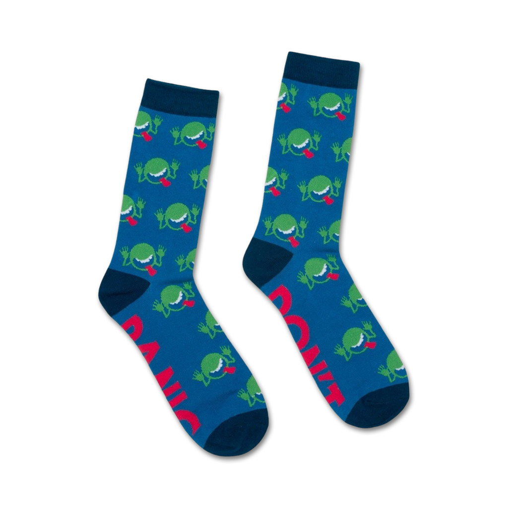 Dive into a literary odyssey with these "Hitchhiker's Guide to the Galaxy" socks. Trek across the cosmos with green cartoonish monsters as your cosmic companions, their red tongues playfully sticking out. These interstellar socks, available in blue with an all-over monster pattern, fit both men and women. Ideal for any Earthling or Vogon seeking a pop of literary flair in their sock drawer, they'll have you pondering the meaning of life, the universe, and everything, one step at a time.