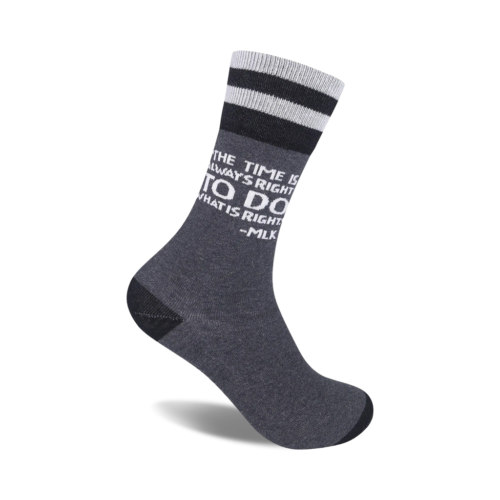 In a world where socks are gray and boring, The Time Is Always Right socks charge into the scene like a civil rights march. Inspired by Martin Luther King Jr.'s timeless words, these socks remind us that justice and equality are never out of season. The black and white striped cuffs add a touch of classic style, while the bold quote is a powerful reminder to do what's right, even when it's tough. Whether you're marching for justice or just marching to the office, these socks will keep you motivated and stylish.