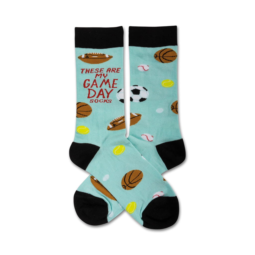 **Game Day Socks A Touchdown for Your Feet!** Charge onto the field or court with team spirit bursting from your feet! Our Game Day Socks are a winning combination of bold style and remarkable comfort, rocking a light blue background, black toes and heels, and a fierce lineup of sports balls. Grab a pair of these socks and let your passion for the game shine whether as a player or a dedicated fan cheering from the sidelines.