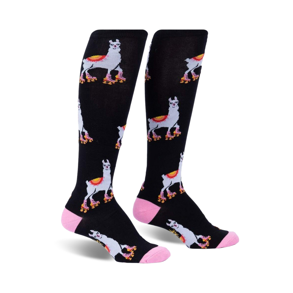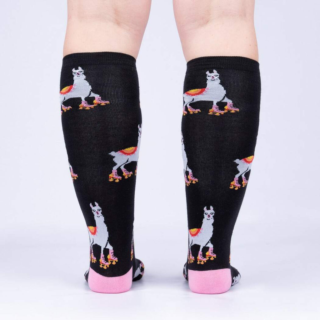 Hey, sock enthusiasts! Meet "They See Me Rollin'", the knee-high black socks designed exclusively for women with a quirky twist: A pattern of white llamas rockin' pink and yellow roller skates with vibrant yellow, red, and blue wheels! These socks are not just a fashion statement; they're a conversation starter. Who knew llamas could skate? You'll be the talk of the town, or at least your next sock-appreciation gathering. So, slip on a pair of "They See Me Rollin'" socks and let the skating llamas take you on a wild adventure with every step!