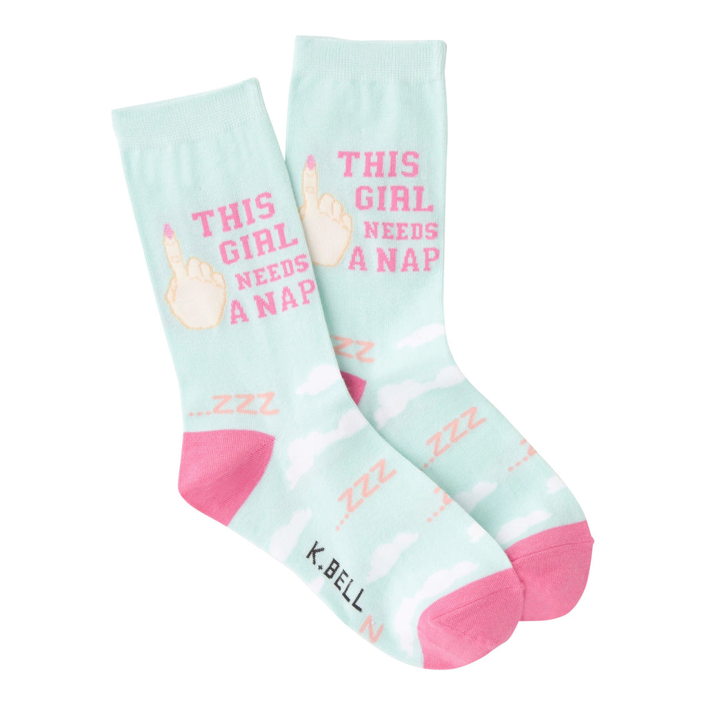 Sleeping in isn't always an option. Sometimes you have to squeeze in a little nap! This refreshingly cool pair of blue and pink crew socks will have you catching Z's in style. Each fun sock features a “Zzz” and cloud print all over. The phrase “This girl needs a nap” is printed above the ankle with a hand pointing up.