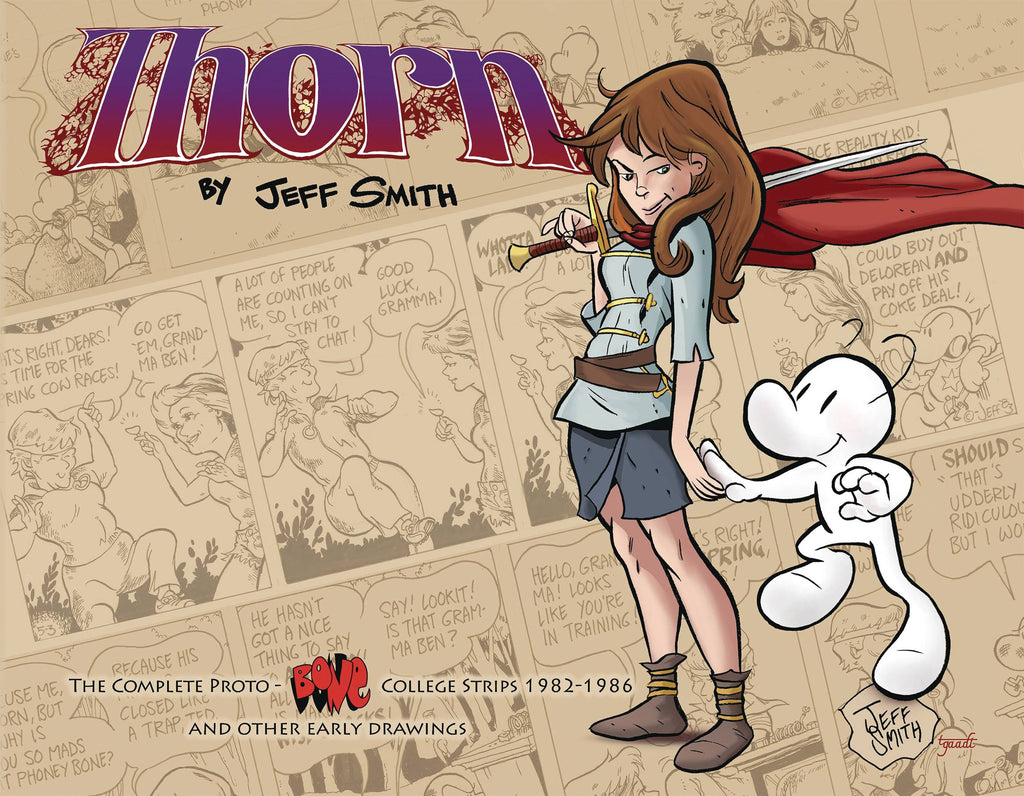 The secret origin of Jeff Smith's BONE Comes to Light! Cartoon Books presents THORN: The Complete Proto-BONE College Strips from 1982 to 1986, and Other Early Drawings, reprinting the entire run of his earliest rendering of Jeff Smith's world-famous BONE characters for the first time. These comic strips reveal an early version of BONE called THORN that was written for a college audience in the 1980s. THORN appeared in the pages of The Ohio State University's student newspaper The Lantern. A few were reprinted in a self-published 1983 book called THORN: Tales from The Lantern. Another small selection was published in 2008's limited edition fundraiser for OSU's Billy Ireland Cartoon Library & Museum called Before BONE. There has never been an official, complete run published until now. This beautiful edition includes plenty of bonus material such as recently discovered early drawings of the BONE characters, essays and interviews.
