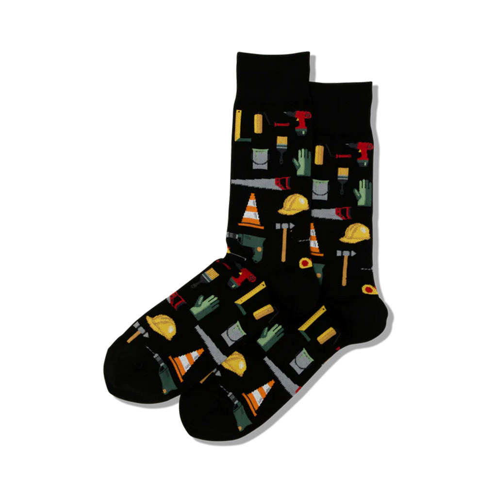 Tools socks: Put on your tool belt, grab your hard hat, and get ready to renovate your sock drawer with this pair of crew-length socks designed for handymen and DIY enthusiasts. With its playful pattern of hammers, saws, wrenches, screwdrivers, gloves, and caution tape, these black socks will turn you into the neighborhood's most stylish fixer-upper.