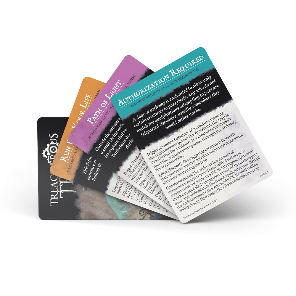 Save time while prepping or grab traps on the fly! Inside you’ll find 50 premade trap cards to challenge your level 17-20 party, ranging from minor setbacks to deadly threats.