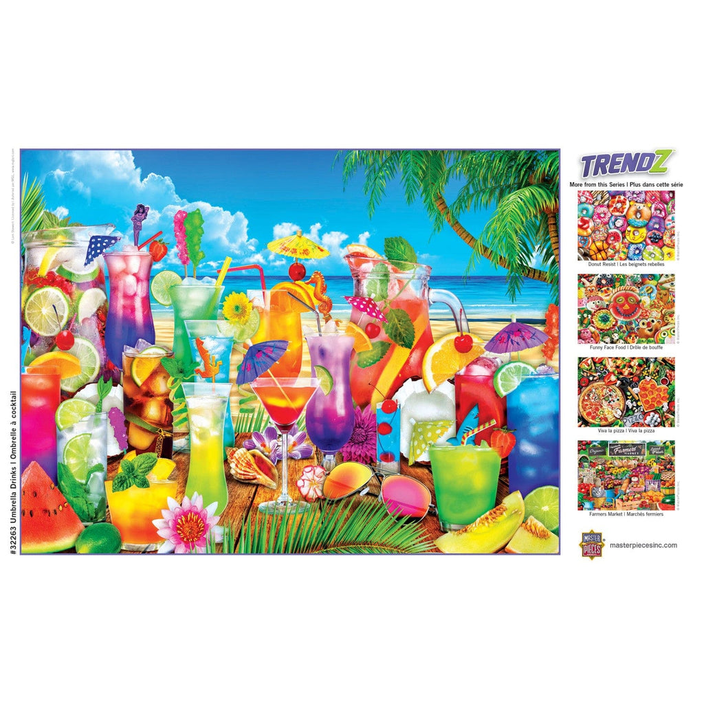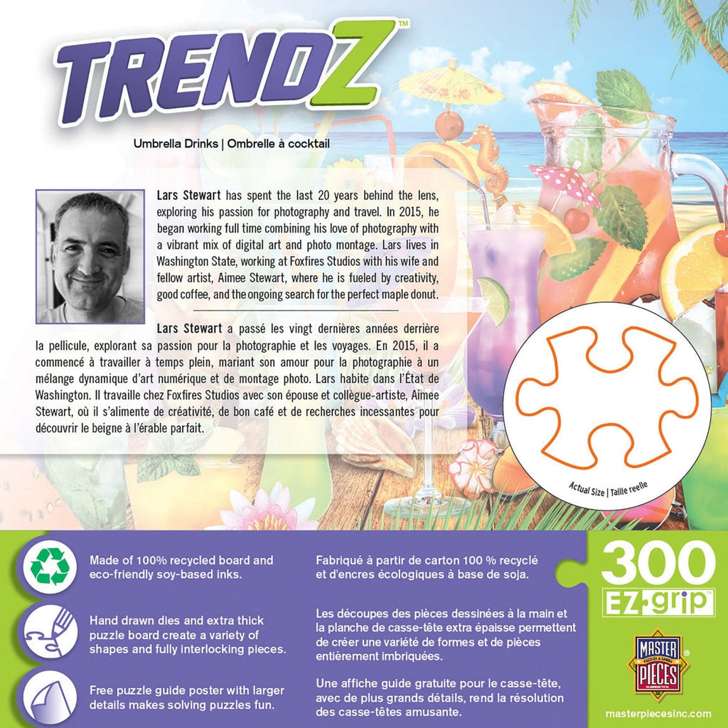 This MasterPieces 18" x 24" 300pc EZ Grip Trendz Collection features hip images of favorable styles, or influences we see trending today. Enjoy a colorful and tasty treat as the waves lap the shore. Paradise can be found in the cool breeze or the tangy and sweet chill of a fancy umbrella drink. Make it your own creation or find something for everyone. The EZ-Grip die-cut used to make this puzzle offers larger puzzle pieces that snap together perfectly, without compromising image quality. To reduce its impact on our environment, the chipboard used in this puzzle is made of 100% recycled material.