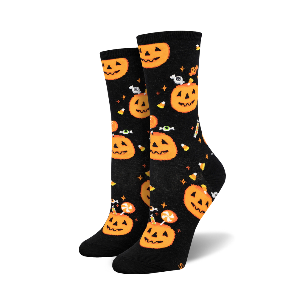 The Trick or Treat socks are spooktacular! With a hauntingly good pattern of orange pumpkins, wrapped orange and white candies, and a black background, these socks will have you spellbound. Whether you are brewing up potions, carving pumpkins with your coven, or just trick-or-treating, these socks will add a touch of hocus pocus to your Halloween festivities.