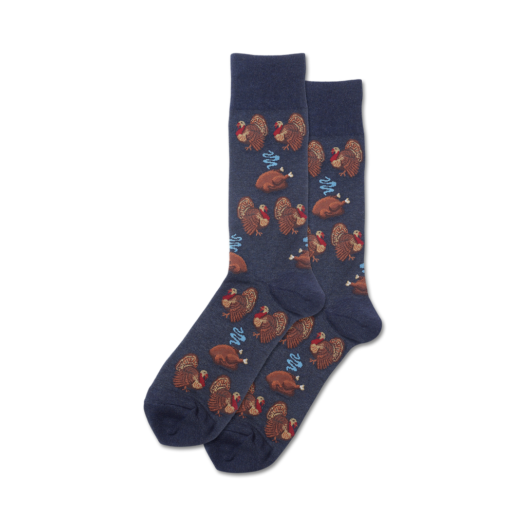Gobble til you wobble in these Turkey Day crew socks! Featuring a flock of cartoon turkeys sporting Pilgrim hats and cornucopias, these socks are sure to get you in the Thanksgiving spirit. Don't be a turkey, strut your stuff in these festive socks and show everyone you've got the holiday spirit!