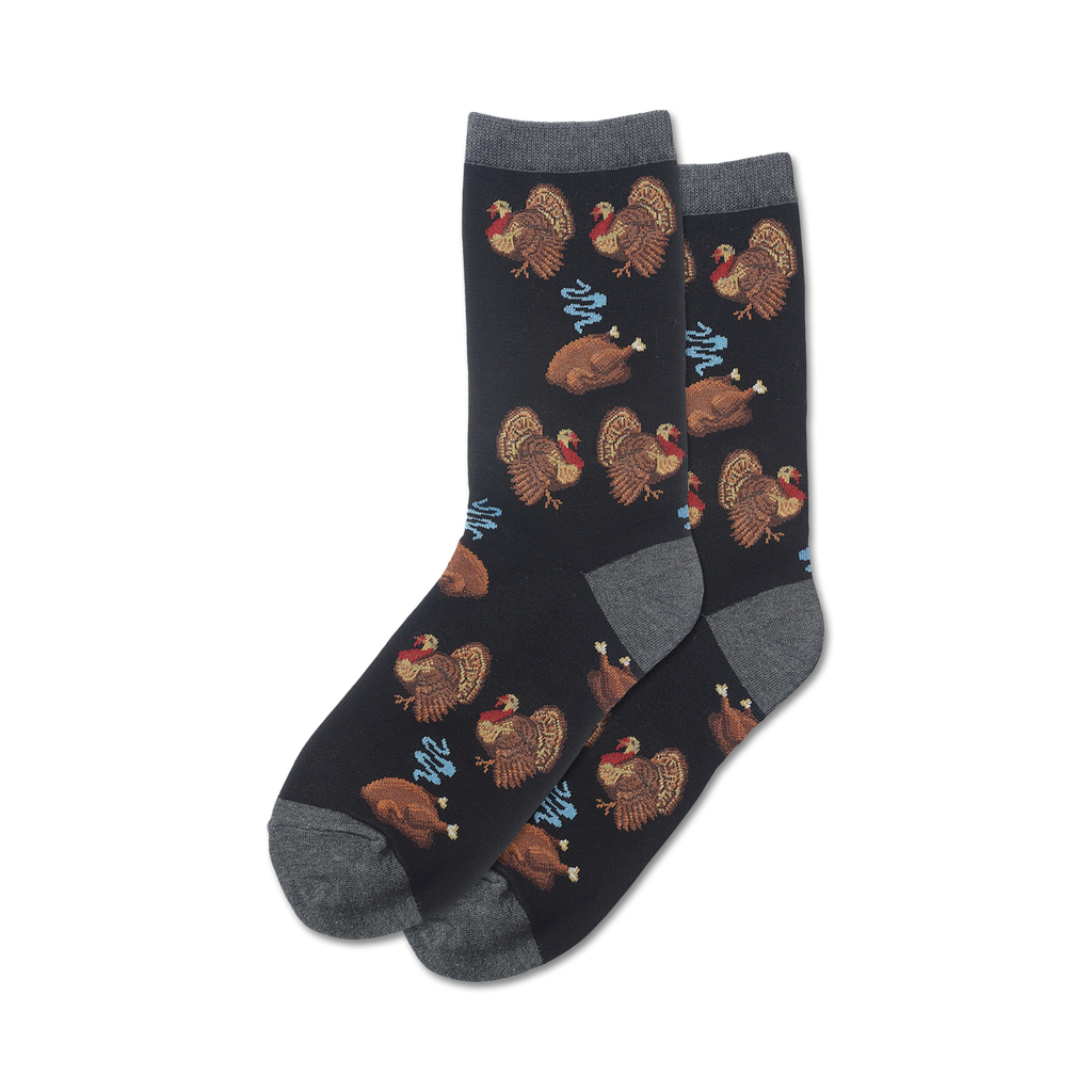 Strut your stuff in these Turkey Day socks and let everyone know that you're ready to gobble up some fun! With a pattern of cartoon turkeys wearing Pilgrim hats and roasted turkeys with drumsticks, these crew socks are guaranteed to make you the life of the party. Plus, they're made for women, so you know they'll fit like a glove. Gobble gobble!