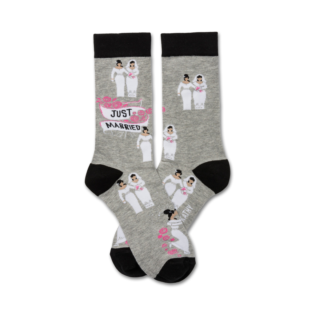 Get ready to walk down the aisle in style with our "Two Brides" socks, featuring a playful pattern of brides holding hands and a "Just Married" speech bubble. These cotton crew socks are perfect for the modern, fun-loving bride who wants to add a touch of whimsy to her wedding day. Celebrate your commitment to love and equality in these comfy, stylish socks. And while you're at it, why not have your bridesmaids join in on the fun and get matching socks? Perfect for the pre-wedding festivities, on the big day itself, or even for the honeymoon. Let's put the 'fun' in dysfunctional family photos!