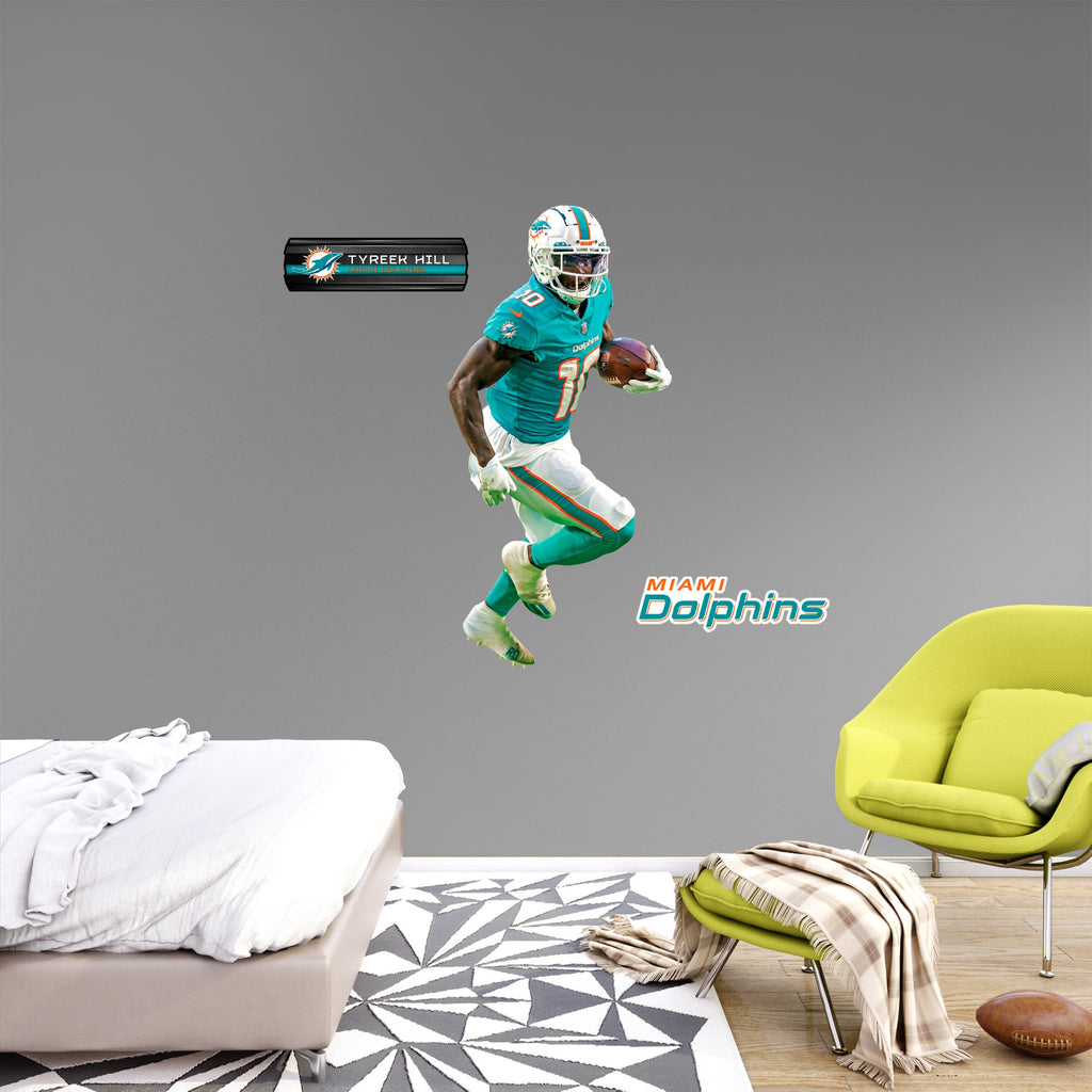 Transform your space into a tribute to your Miami Dolphins fandom with the Tyreek Hill RealBig Collection vinyl wall decals. These reusable decals offer an easy, no-commitment way to show off your team pride. Made with precision die-cut edges and a scratch-resistant finish, each decal sticks securely to most smooth surfaces, giving your walls a vibrant, professional look. The fade-resistant inks ensure the colors remain true over time, letting you celebrate every moment of the game season after season without worry.