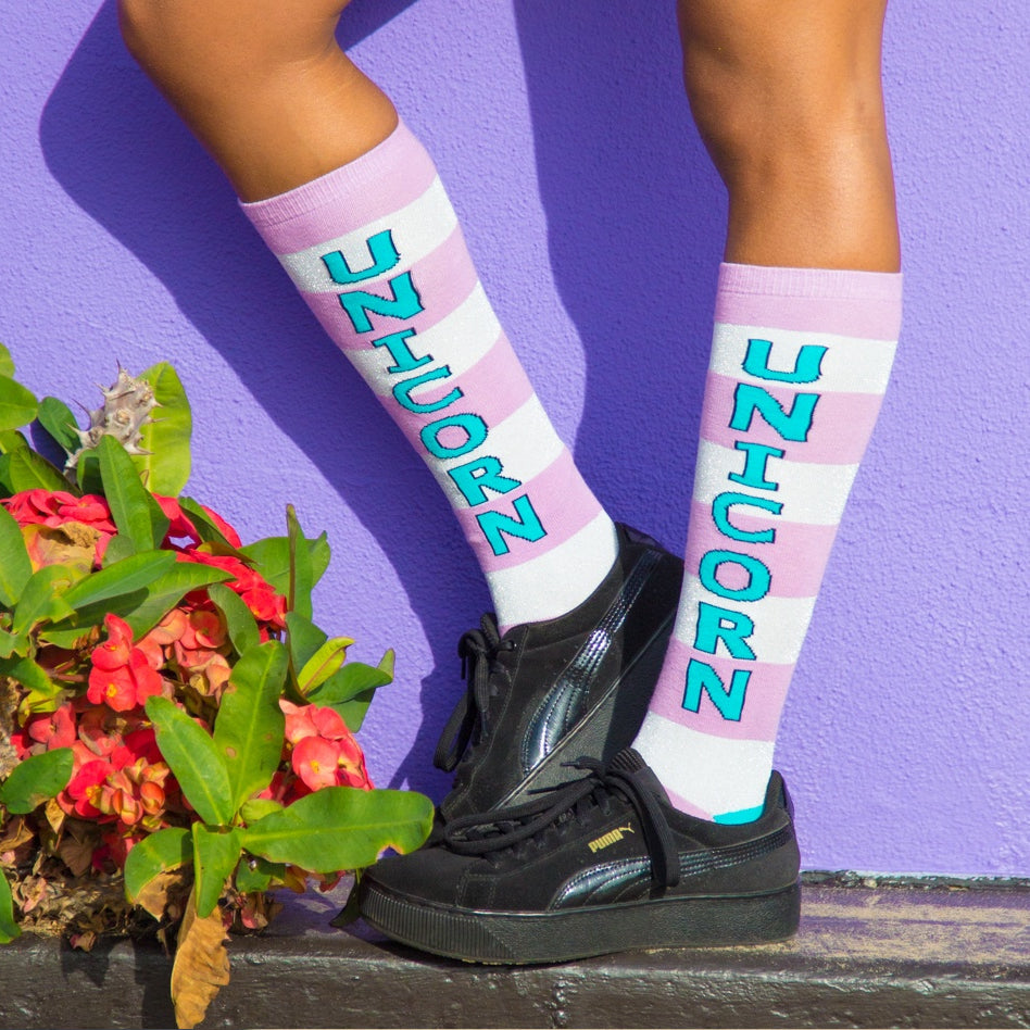 Do you stand out like a unicorn? Unique and Awesome? Let everyone else know just how special you are when you slip into a pair of these cool women's novelty knee high socks! Each fun pair features the word “Unicorn” printed along the sides against a purple and white striped background.
