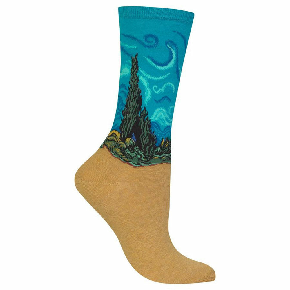 Frolic in the calming fields and breathe in some fresh poetic air. One of Vincent van Gogh's most relaxing art works can now be worn on your feet! This fun pair of blue and tan socks features a beautiful replica of his masterpiece, Wheat Field with Cypresses, that starts at the ankle and goes to the cuff.