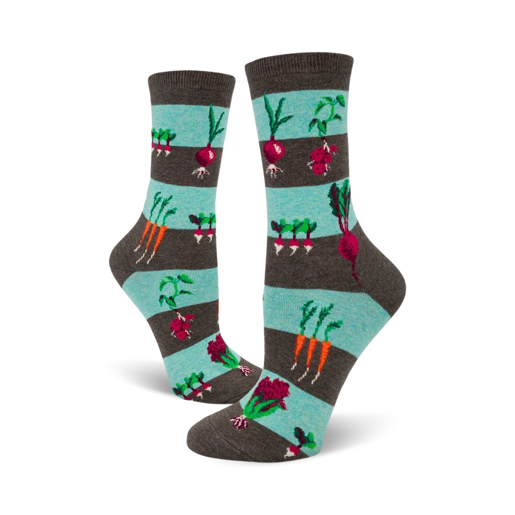 From the garden to your feet, these veggie-inspired socks are the pick of the bunch! They're as colorful as a farmers market with carrots, beets, and radishes popping on a blue and brown background with green stripes. Carrot-ally fun!