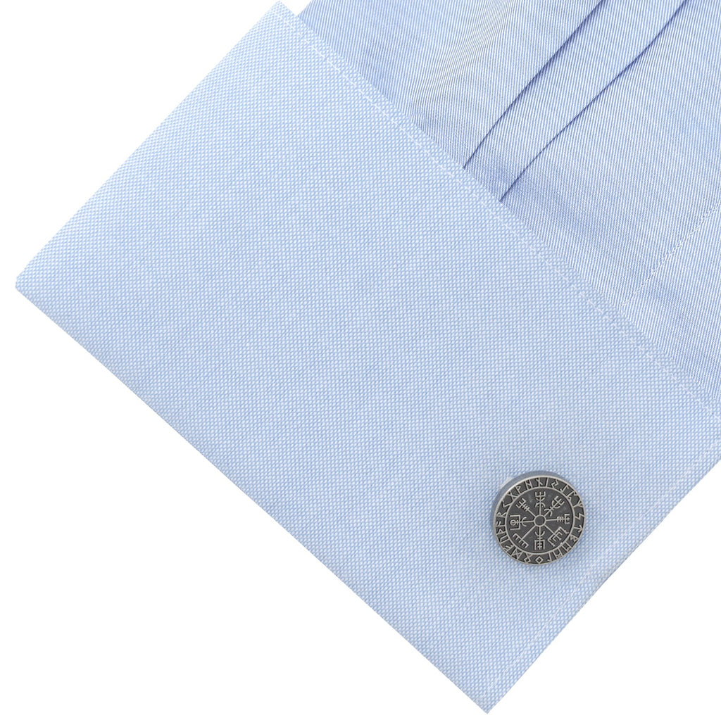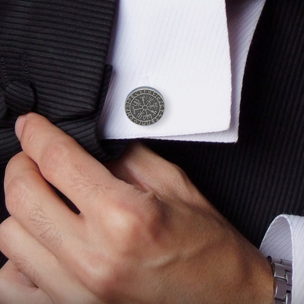 Vegvísir, meaning "Way Shower", ensures the user will not lose their way. This compass, made with an antique finish to show its runic design, is a symbol known as the Viking Compass or Nordic Compass. With this set of cufflinks, you'll stay on course whether it be in business or on the path of life. The expert craftsmanship of our base metal cufflinks ensures long-lasting durability.
