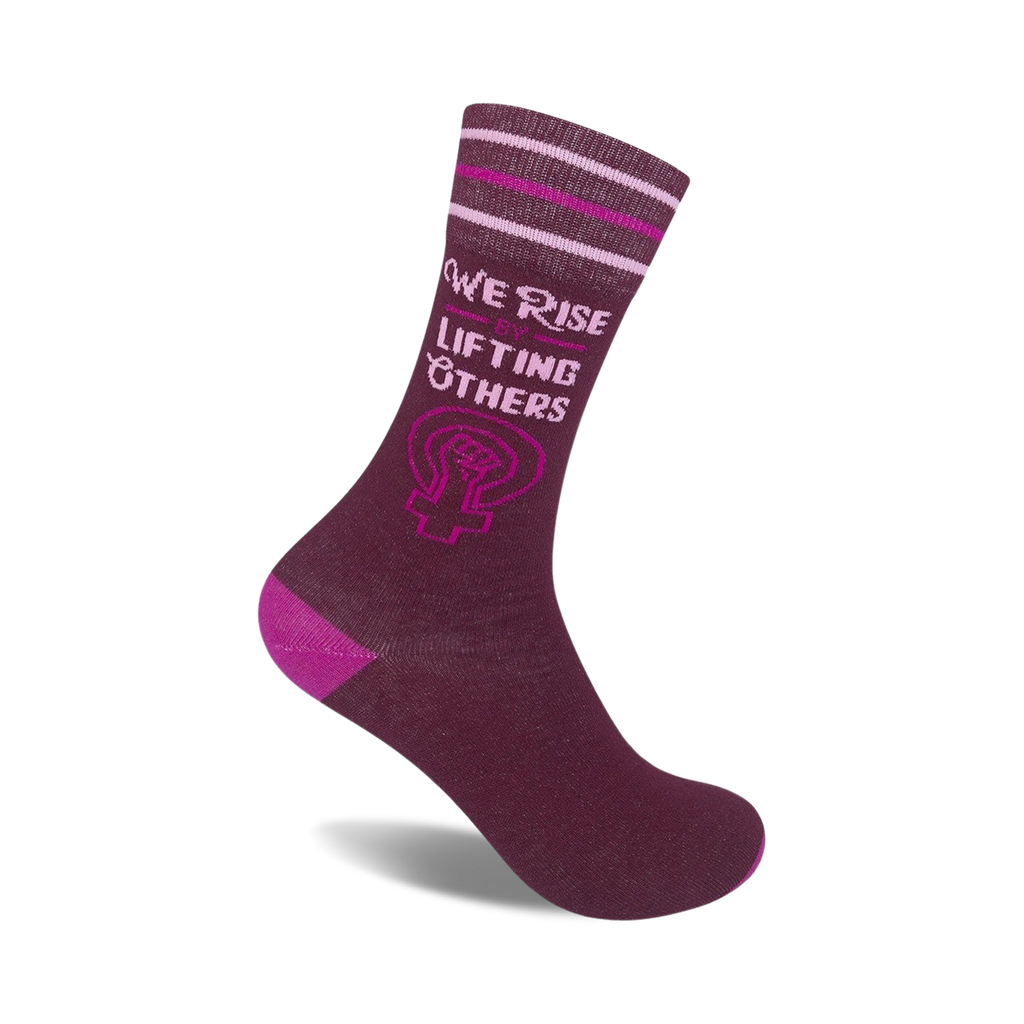 We Rise socks embody strength & resilience! Walk tall in these purple socks featuring the text 'We Rise By Lifting Others' in pink & a symbol of a woman fist raised high, reminding you to lift others as you rise. With a comfy pink & white striped band & pink heel/toe. It's a subtle reminder that together, we can achieve greatness.