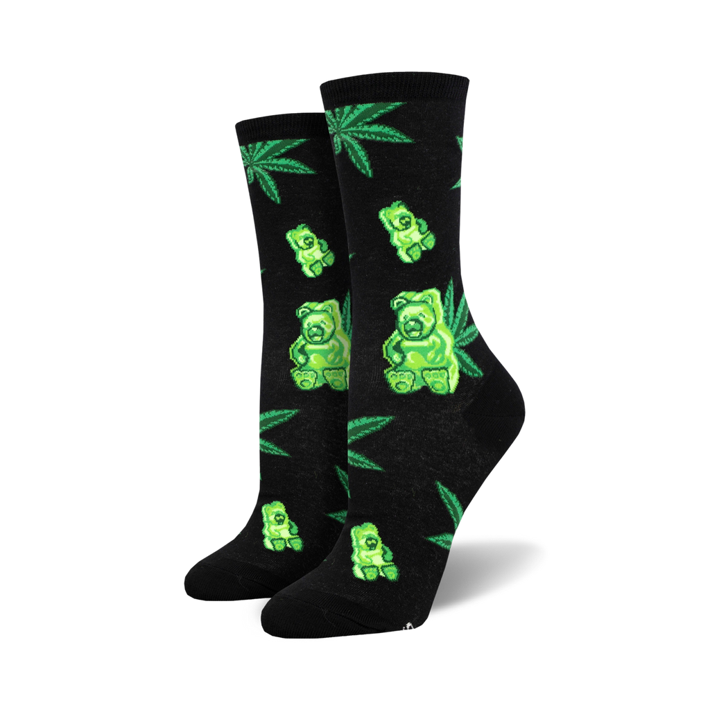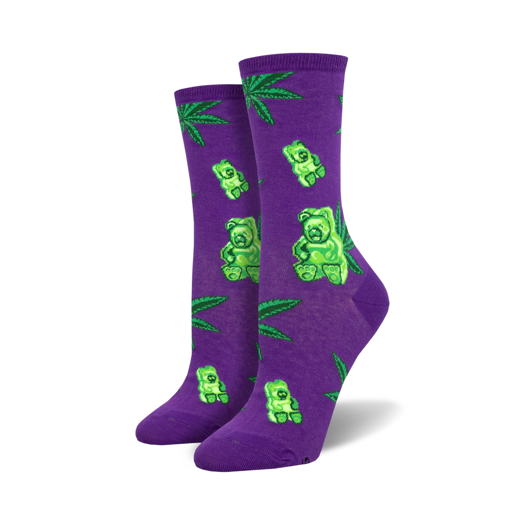Call all the dope babes, stoners and ganja goddesses! Our Weed Gummies socks are calling out to you. Get your feet into these funky purple socks covered in happy green gummy bears and marijuana leaves. Plus, these bad boys are made just for you ladies with a crew length that'll keep your feet fly. So, slip on a pair of these herb-tastic socks and let the good vibes roll.