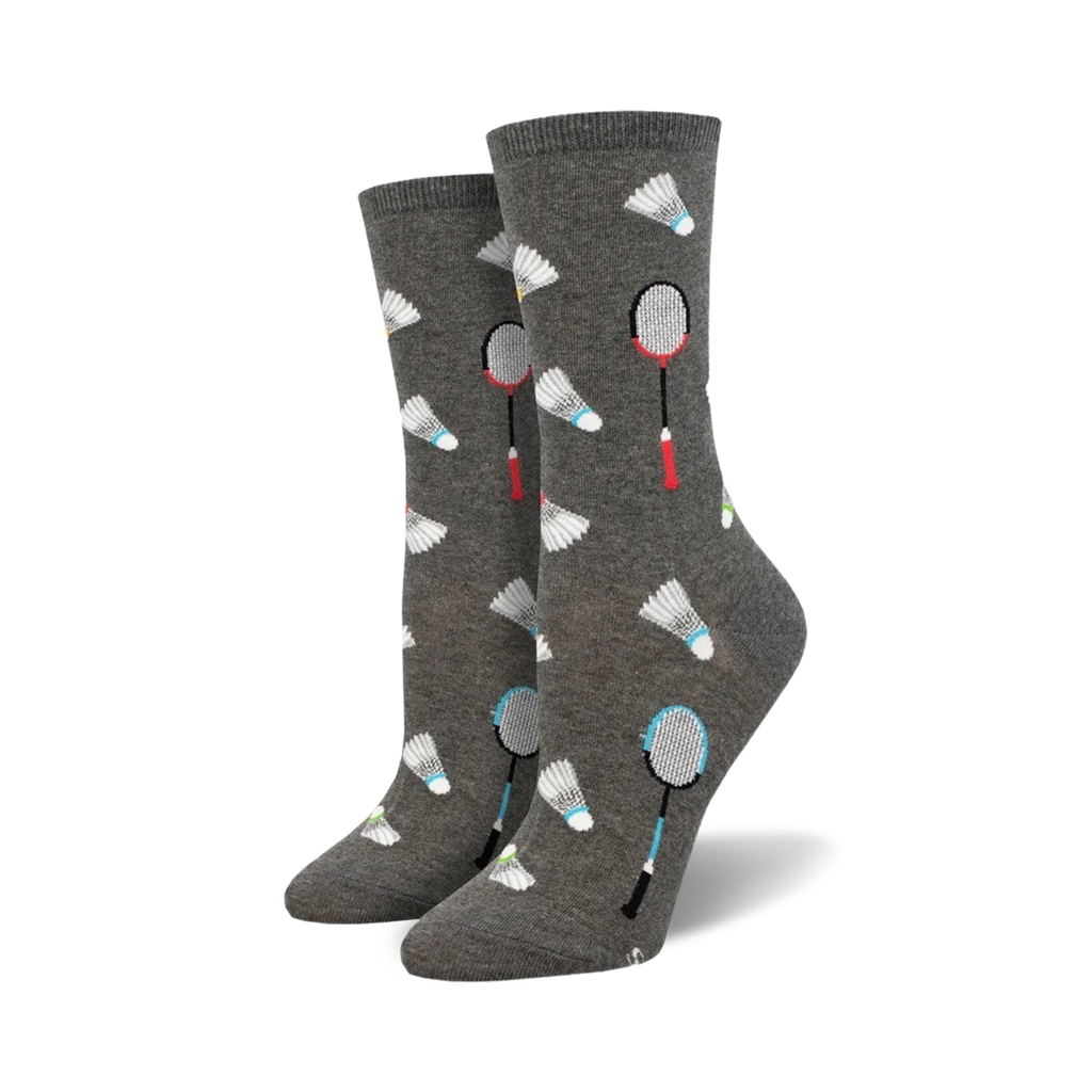 Here's a fun and light-hearted description of the socks: Serve up a stylish ace with these badminton crew socks boasting a pattern of red, blue, yellow, and white shuttlecocks and rackets. With a snappy title like "What A Racket," these socks are sure to score high on the fashion court. Not only will you look like a pro, but you'll be one too, because these socks double as a good luck charm for your next match. And guess what? They come with a free copy of "The Badminton Bible" to help you brush up on your skills.