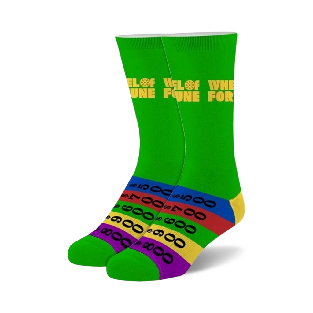 Talk about the Wheel of Fortune like a used car salesman, but with socks! Spin the sleek, stylish, and guaranteed-to-win Wheel of Fortune crew socks onto your feet and let your toes take a chance on fashion. With its vibrant green base and eye-catching numbers and letters, these socks scream good luck. Whether you're a fan of the show or just a fan of fun, these socks will make you feel like a million bucks.