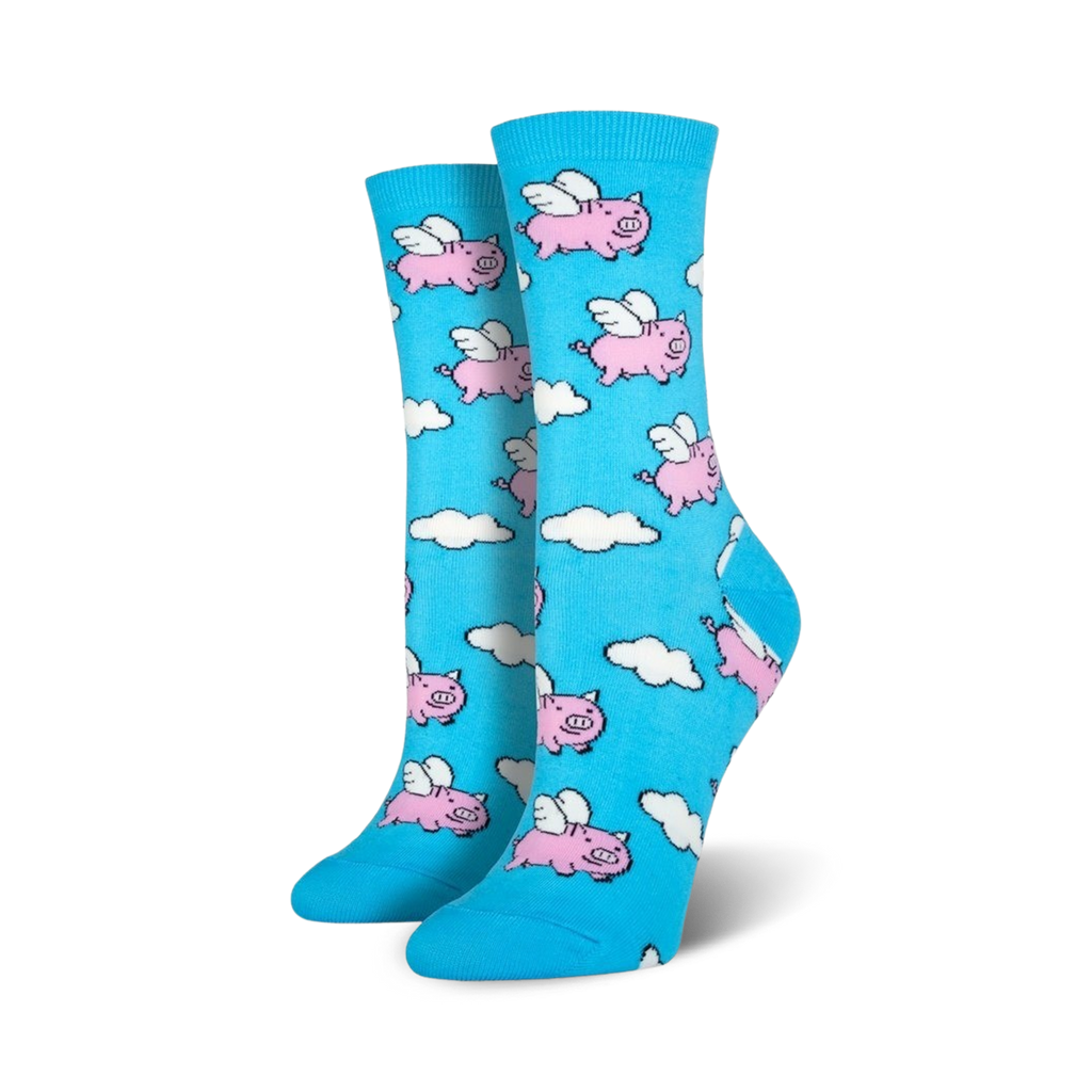 Flying pigs are so cute! Wear them on your feet and show everyone just how adorable they are. Each awesome women's novelty crew socks feature winged pigs flying around some clouds printed all over against a light blue background.