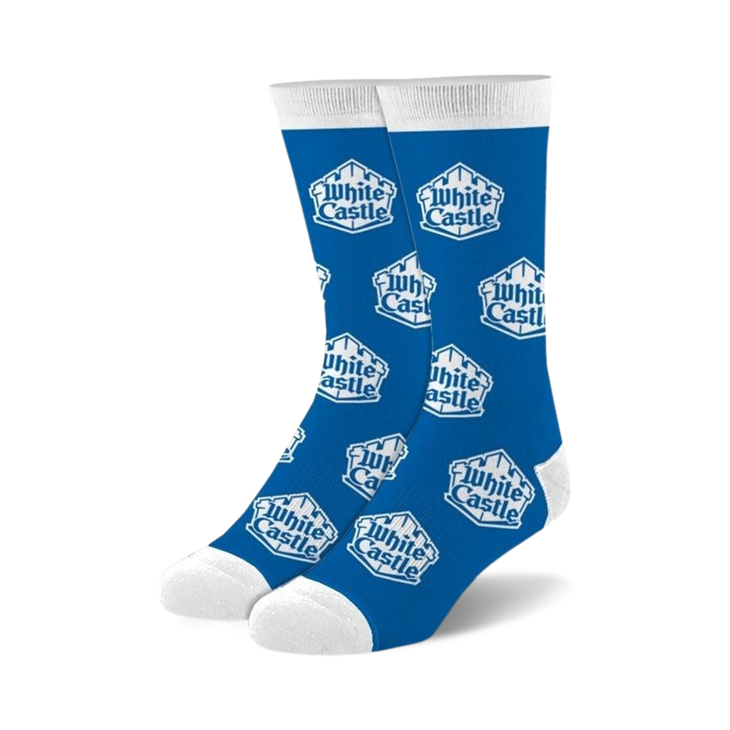 Get your order of fun in these sky blue socks covered in the White Castle logo! These tasty kicks are sure to satisfy your craving for a little something extra.