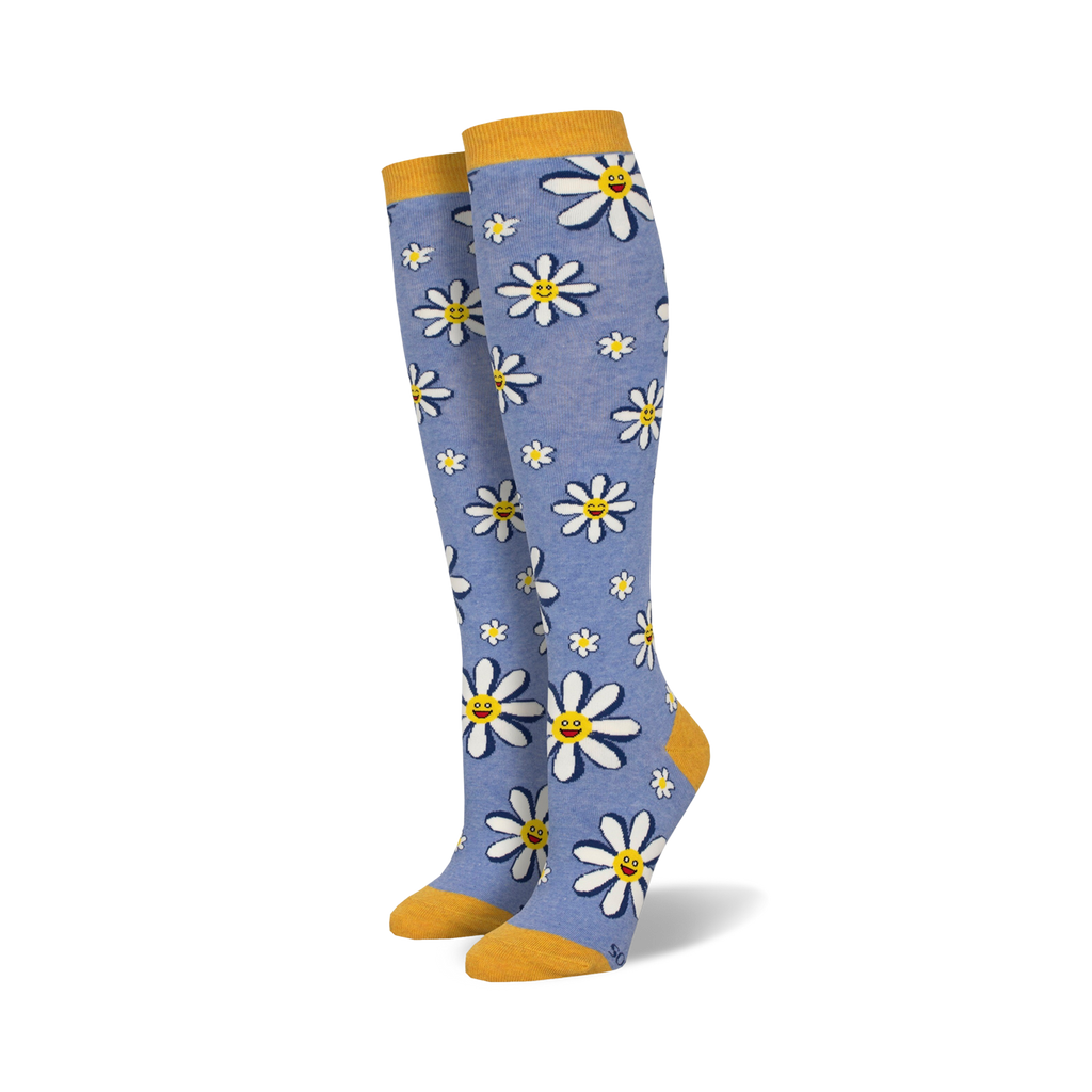 Whoopsy Daisy! These knee-high socks are a playful take on the classic daisy motif, with cartoonish white daisies blooming against a black background, each with a yellow center and a cheerful smiley face. The yellow cuffs and heels add a pop of color and fun, making these socks perfect for brightening up any outfit. With these Whoopsy Daisy socks on your feet, you'll be sure to spread smiles wherever you go!