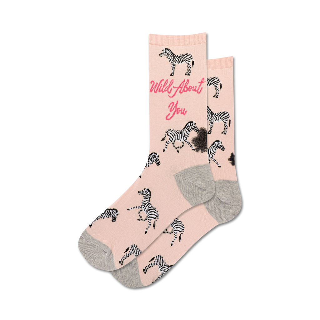 Get ready to go wild and let your feet lead the way in the "Wild About You" zebra socks! These crew-length, pink socks feature a striking pattern of fierce black and white zebras. With their playful "Wild About You" slogan, these socks are perfect for the playful fashionista with a zest for life. Slip on a pair of these and dare to stand out, whether you're roaming the urban jungle or conquering your personal savannah. These socks are the ultimate symbol of resilience and style. So, get wild and embrace your inner zebra today!