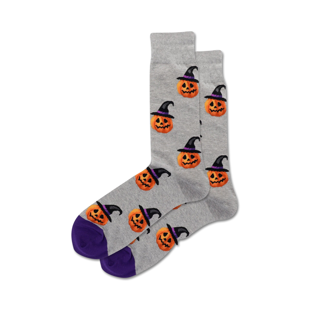 Bewitching and Boo-tiful! Slip into a pair of Witch Pumpkin socks for some spooky, silly style. These gray crew socks feature a quirky pattern of cartoon pumpkin heads with friendly faces and pointy witch hats. They'll make you the life of the Halloween party! Fun fact: Pumpkins contain 90% water. Keep calm and gourd on!