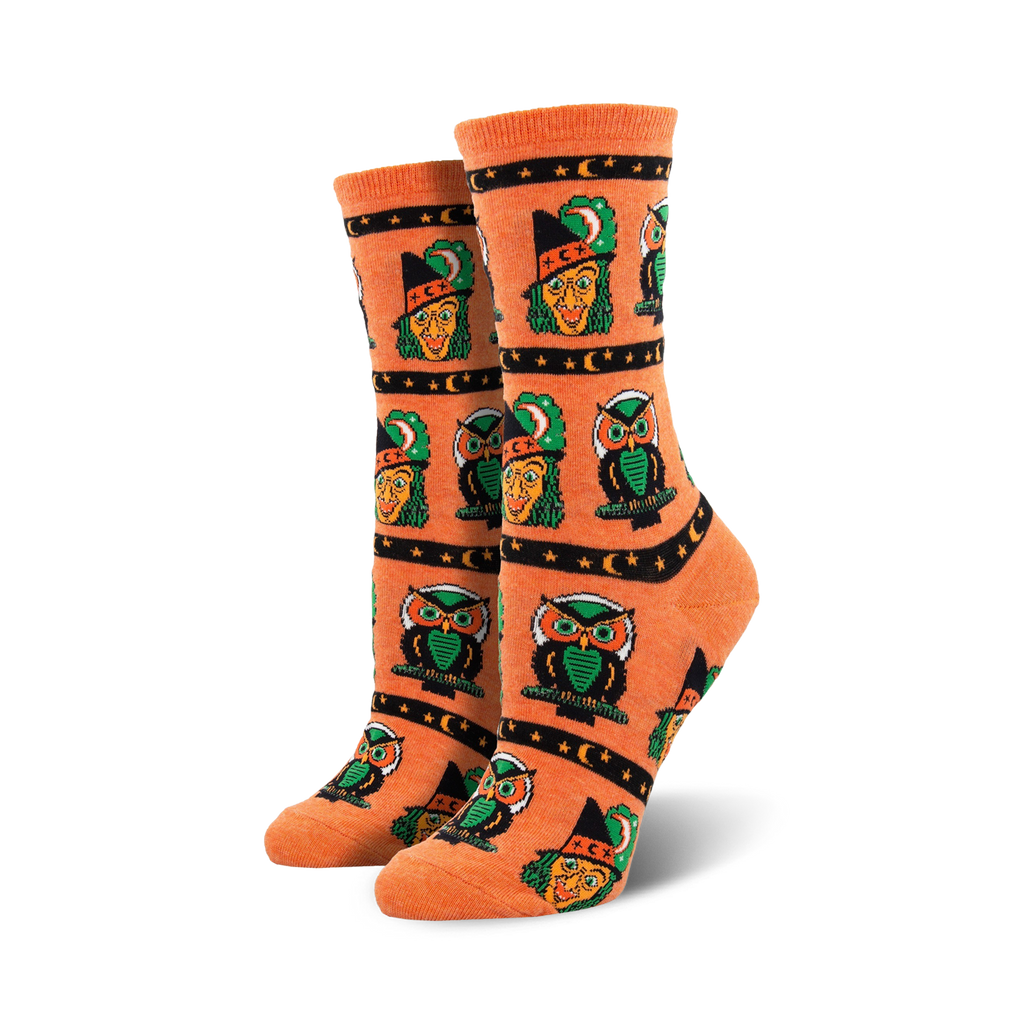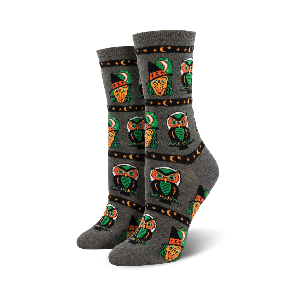 Calling all witches, wizards and warlocks! Add a touch of magic to your feet with our Witchcraft Wonders socks! Featuring a mystical gray backdrop, bright green owls with pointed orange hats, crescent moons and stars, these socks have Halloween written all over them. With a comfy crew length and band of stars at the top, these socks are your perfect cauldron companion. Get ready to cast a spell on the world with your stylish feet!