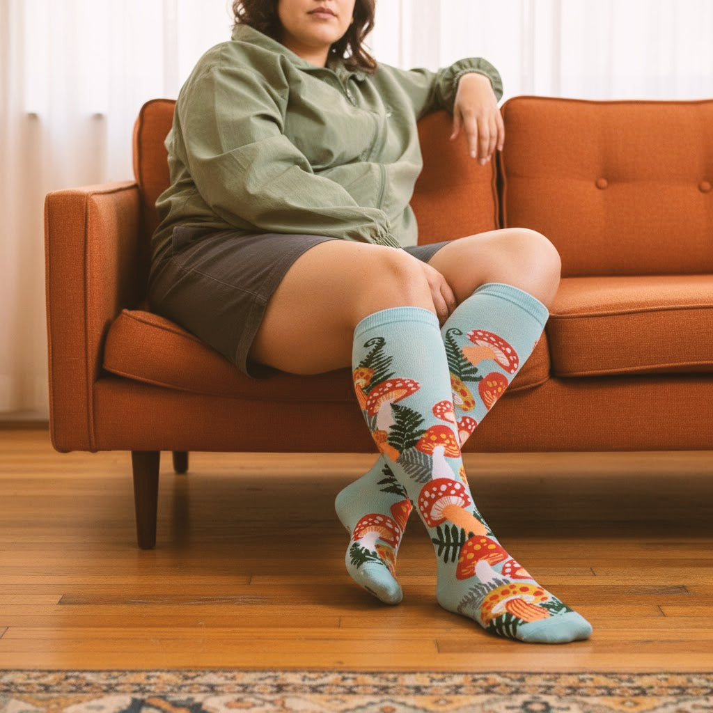 Journey into a whimsical wonderland with our enchanting, knee-high Mushroom socks! Picture a mesmerizing light blue canvas dotted with vibrant red and orange mushrooms adorned with playful white spots, alongside flourishing green ferns. Slip into a world of magic and delight with each step, letting the whimsical design transport you to a realm of endless imagination and joy. Embrace the wonders of this delightful accessory and let your feet embark on an adventure like no other!
