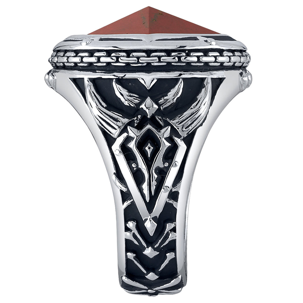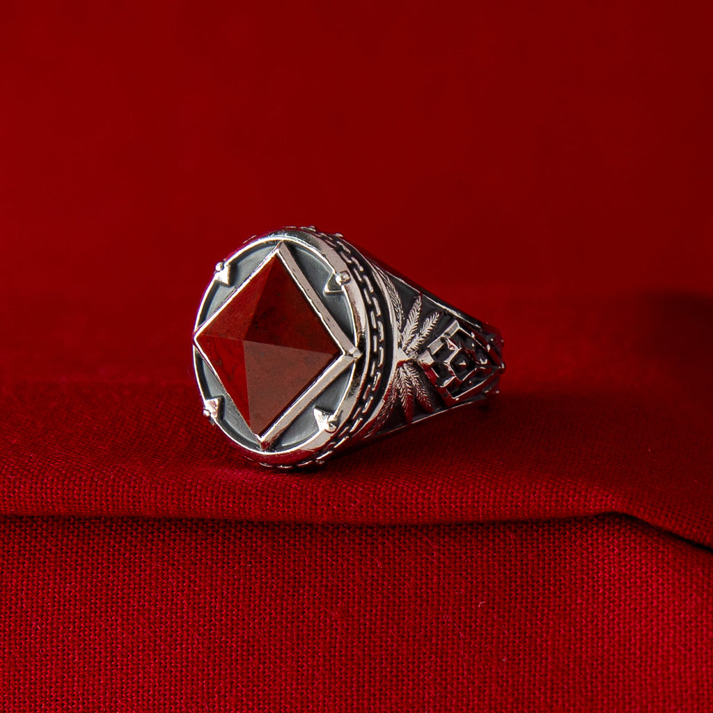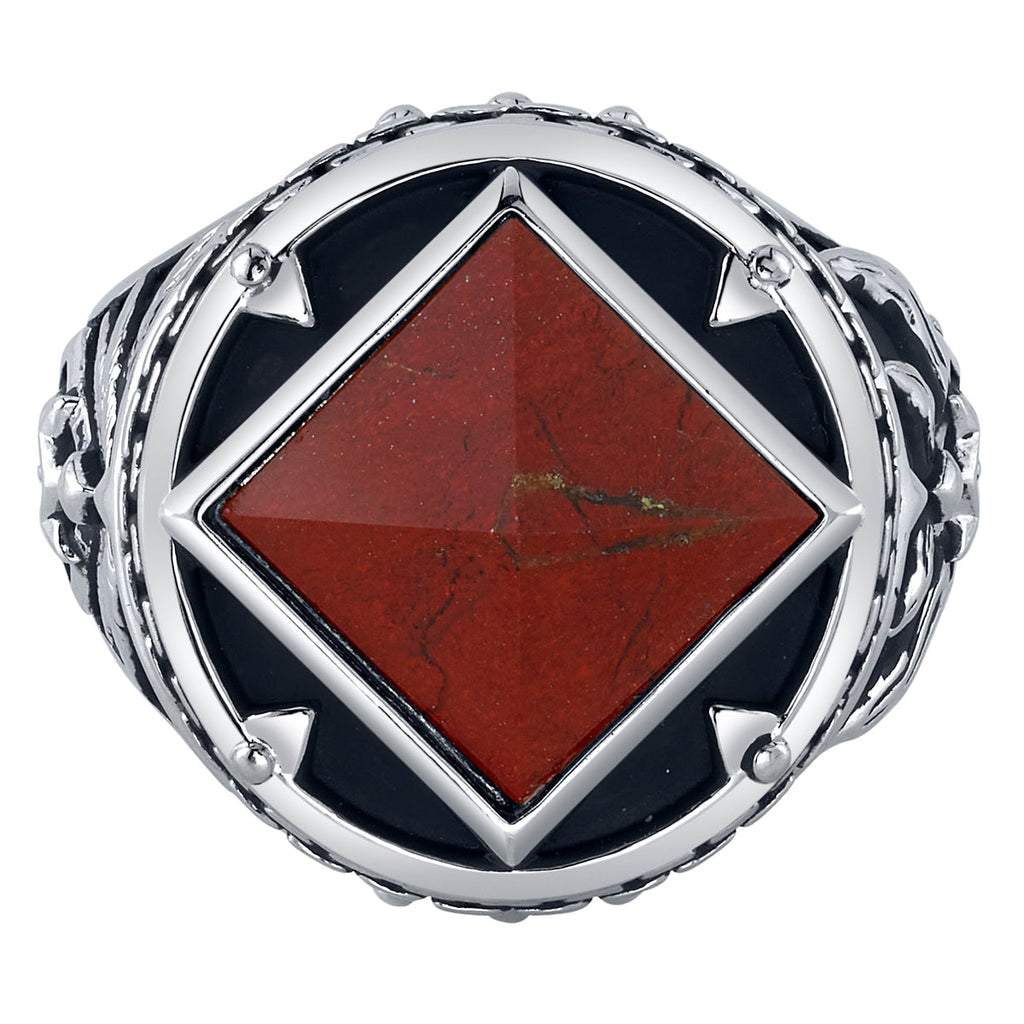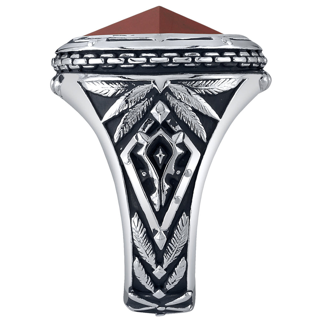 At its heart lies a genuine red jasper gemstone with black flecks and matrix, adding a bold and primal touch. The stone is cut in a polished square pyramid shape set on the diamond angle, encircled by a carved chain with stud and spike details.