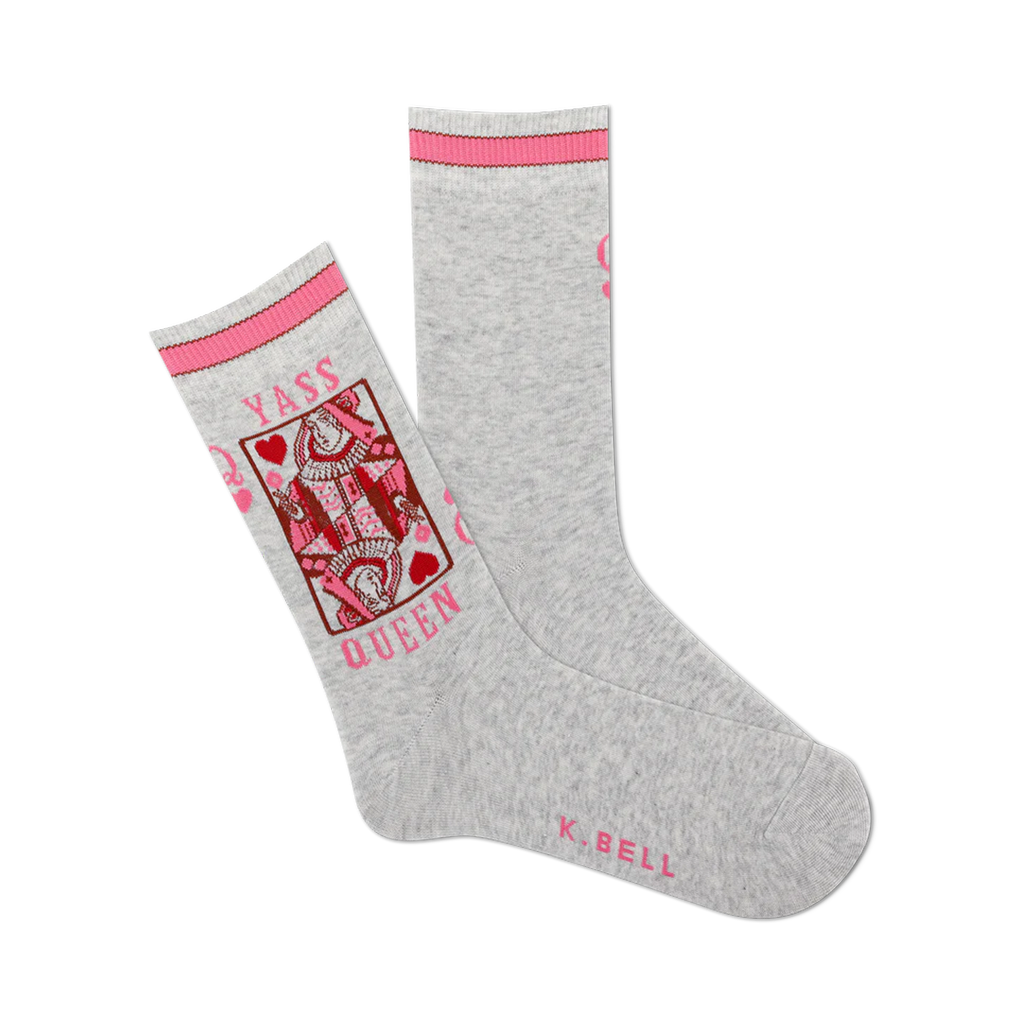Channel your inner royal sass with our Yass Queen socks! Featuring the iconic phrase and a red heart, these gray socks with pink trim are perfect for adding a touch of sassy style to any outfit. Rep the vibes of a queen wherever you go in these cute and comfy crew socks made just for women. They're the perfect reminder that you're the queen of your own castle, so wear them with pride. Bow down to the queen!