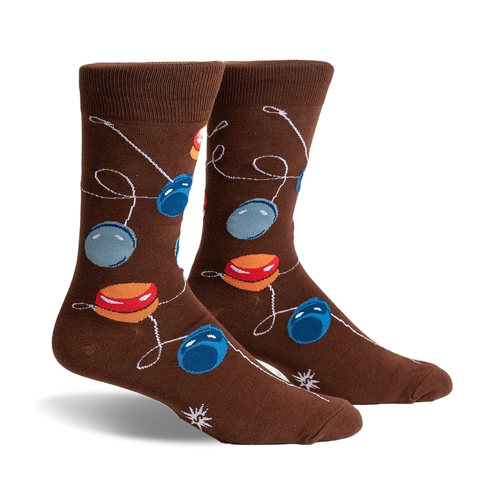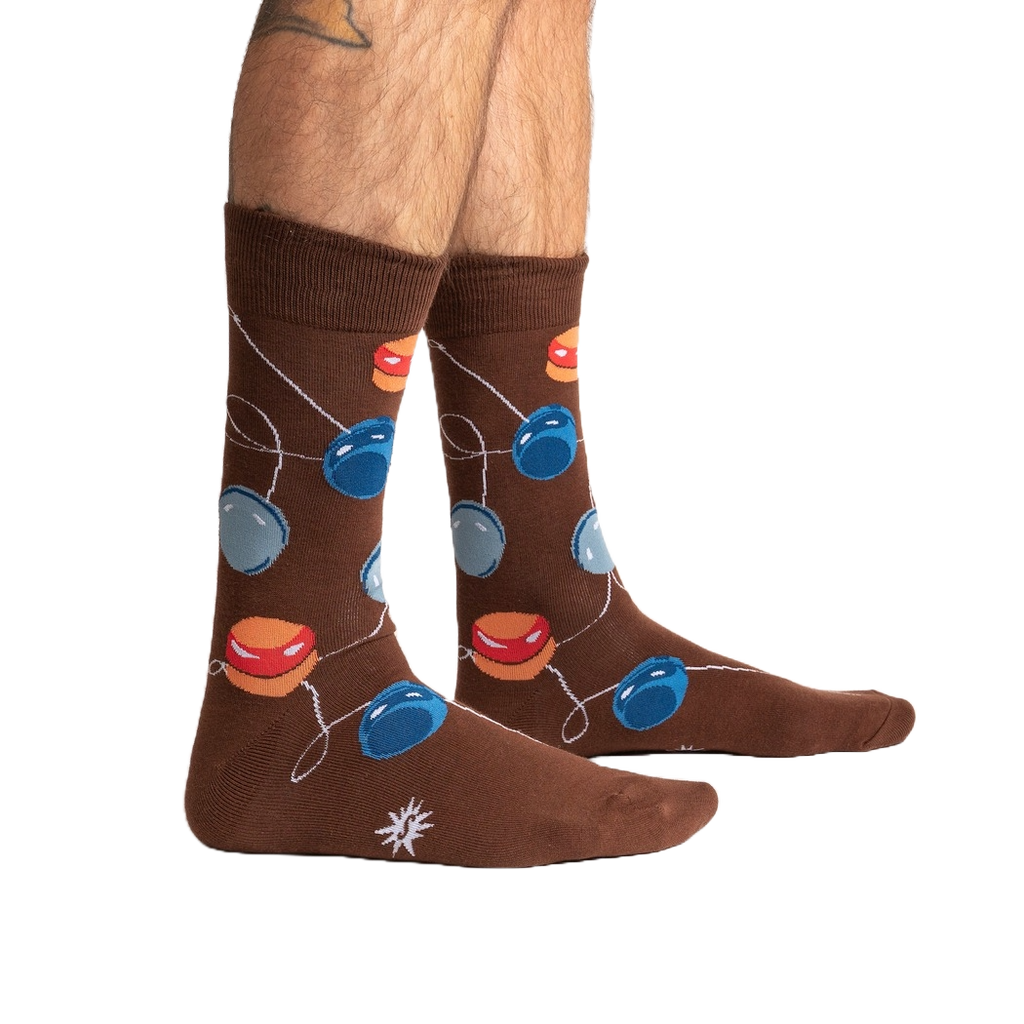 Yo-Yoing Around: Keep Your Feet Happy and Stylish with These Energetic Retro Socks Yo-Yoing Around with these awesome crew socks for men! Have a ball and let your feet do the walking in style with these yo-yo socks. Featuring a colorful collection of bright red, blue, and yellow yo-yos, connected by a white string, these socks are a playful way to add some fun to your everyday look. Whether you're a seasoned pro or just starting out, these socks are sure to make you smile and are guaranteed to become your new favorites.