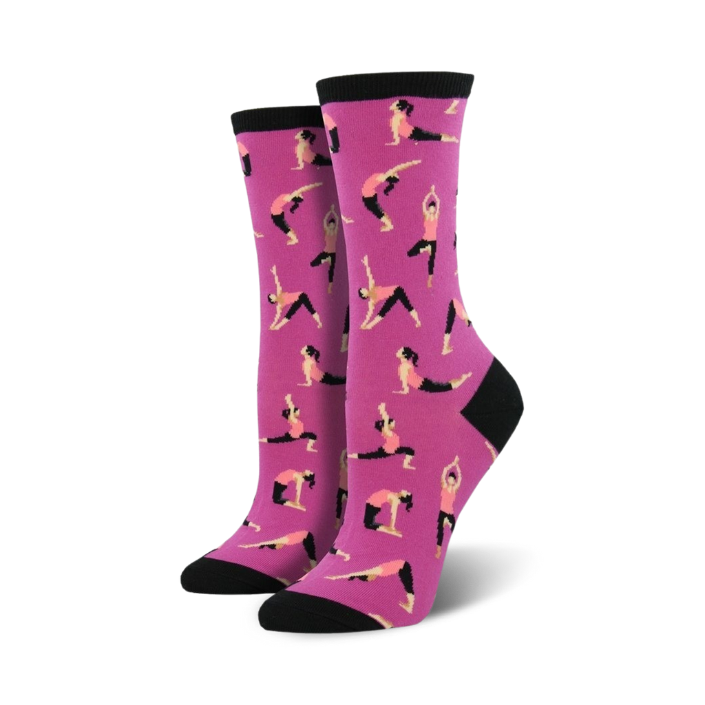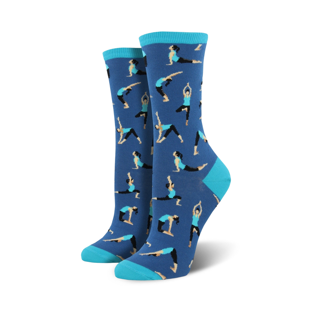 It's no wonder why yoga is so popular. It can help increase flexibility and improve cardio health. It can help you lose weight and reduce stress. If you are a yoga lover, these cool women's novelty crew socks belong in your sock drawer. Each awesome pair features a woman doing different poses printed all over against a blue background.