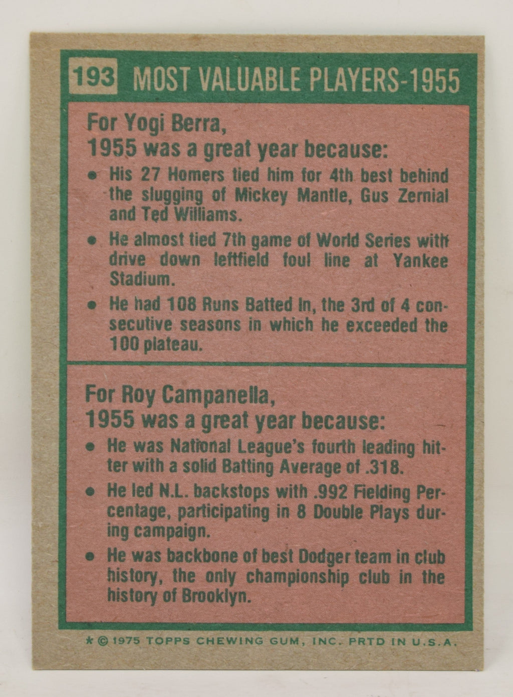 Yogi Berra Roy Campanella Baseball Card Topps 1975 Most Valuable Player 193