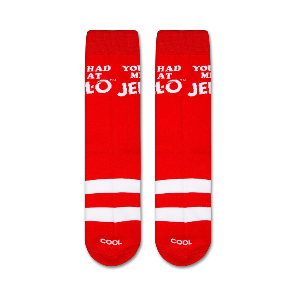 Looking for a way to sprinkle some fun into your everyday attire? Slip into the delightfully charming "You Had Me At Jell-O" socks, and let the laughs follow wherever you tread. These crew-length socks are a blast of bright red with snazzy white stripes and whimsical wording that can't help but conjure smiles. Perfect for lounging or as a quirky conversation starter at parties, these socks are a must-have for those who love to combine comfort with a touch of playful flair. Why wear boring socks when you can make a jelly-good statement?