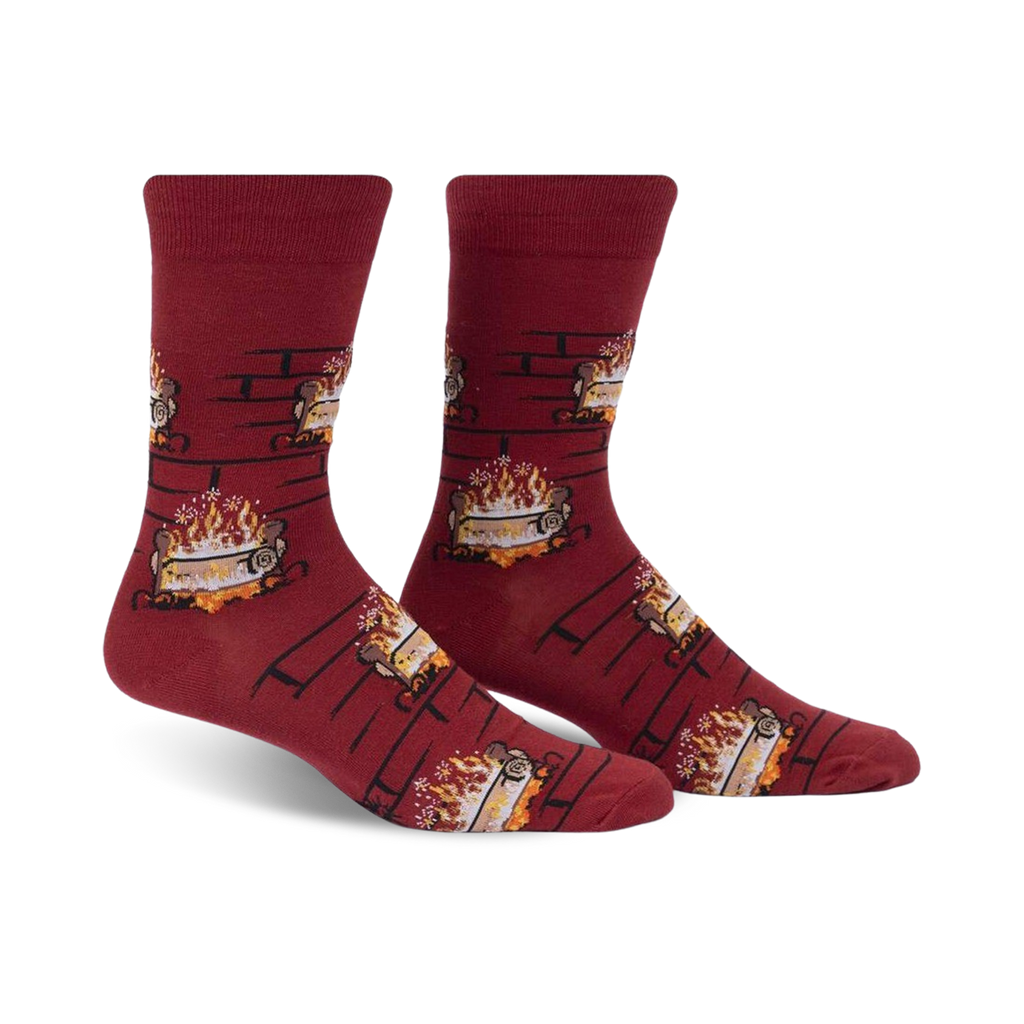 Picture a cozy winter night, a crackling fireplace, and the perfect Christmas accessory on your toes. Yule Log socks, designed for men with a crew length, boast a jolly pattern of logs aglow in a fireplace with joyful flames that dance on top. These festive red socks are sure to bring a touch of holiday cheer to any festive gathering!