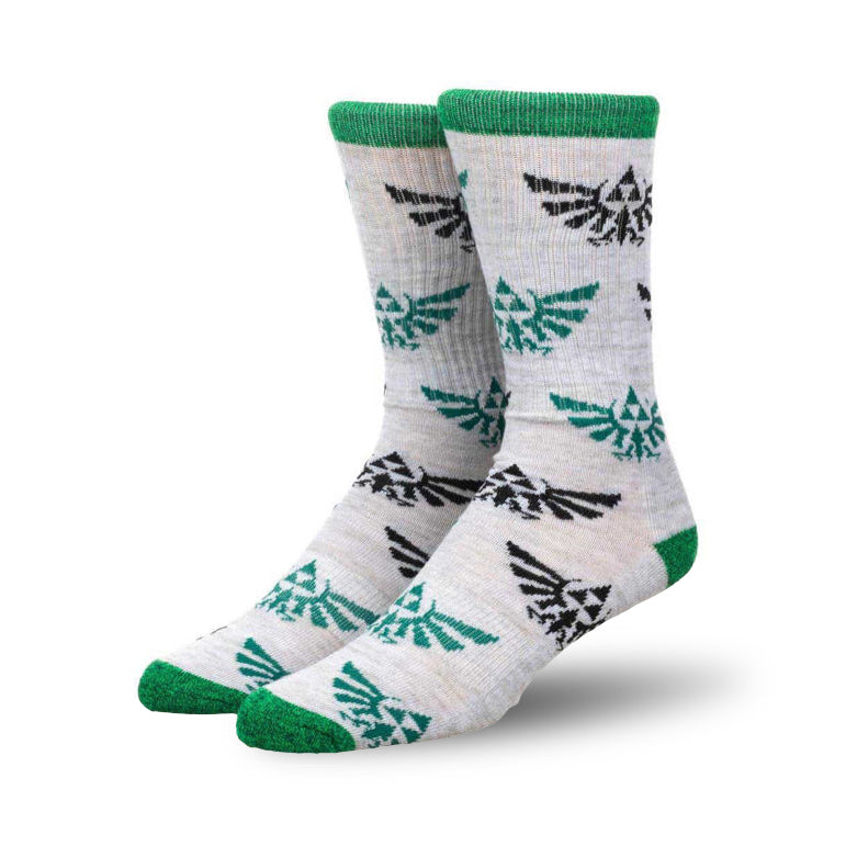 Gray crew socks with a green cuff are adorned with black and green Triforce symbols from The Legend of Zelda video game series. Channel your inner Link as you restore peace to the Kingdom of Hyrule.