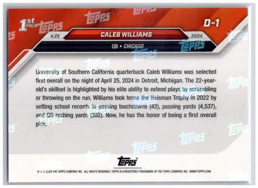 2024 Topps Now Caleb Williams #D1 Rookie RC Football Card