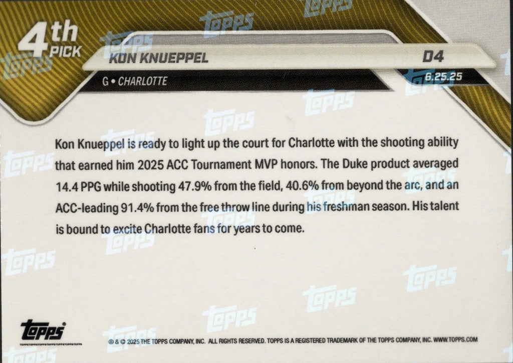 2025 Topps Now Kon Knueppel #D4 Green Foil /99 Charlotte Hornets Rookie RC Basketball Card