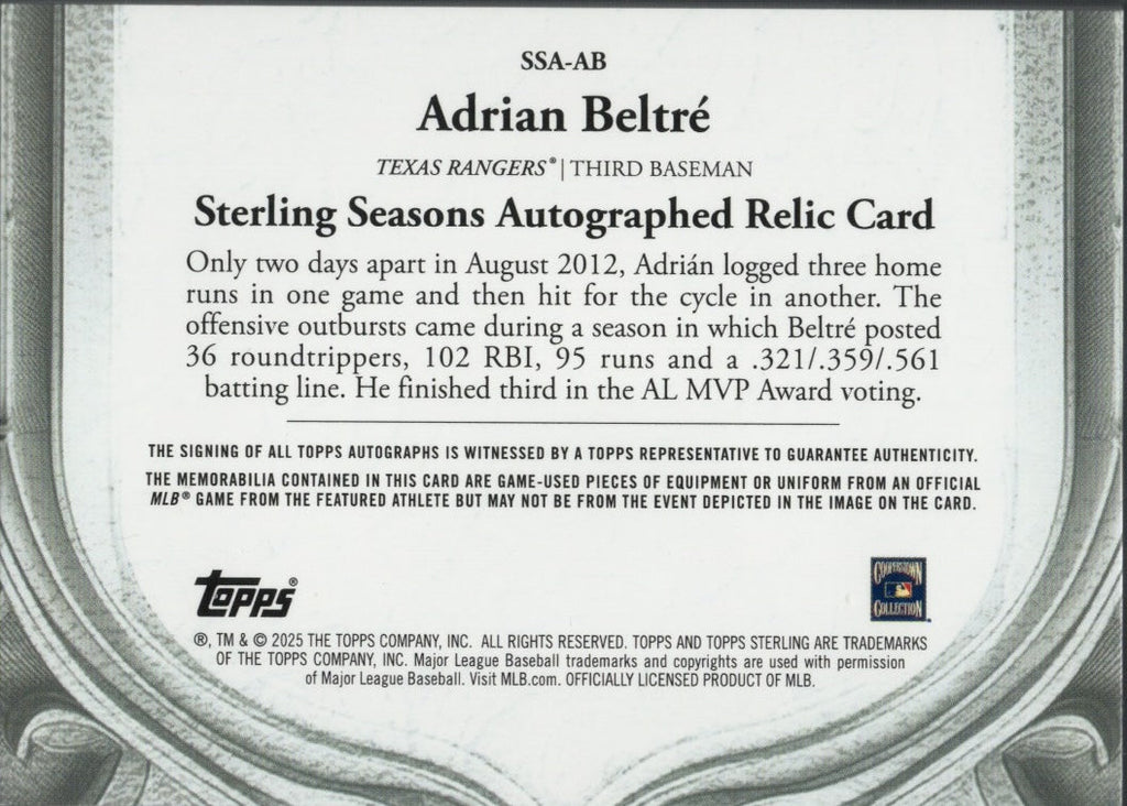 2025 Topps Sterling Adrian Beltre #SSAAB Sterling Seasons 2012 Relic Auto /25 Texas Rangers Baseball Card
