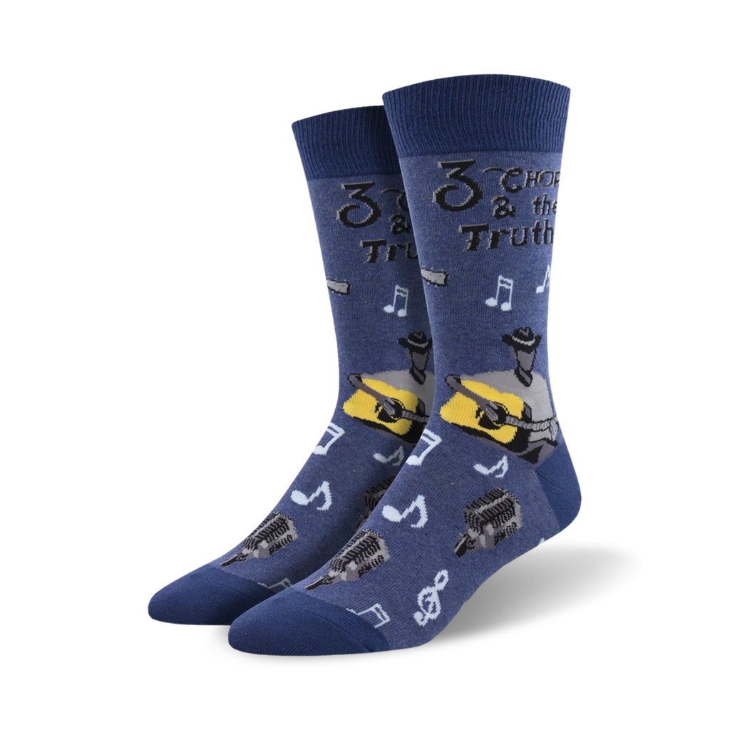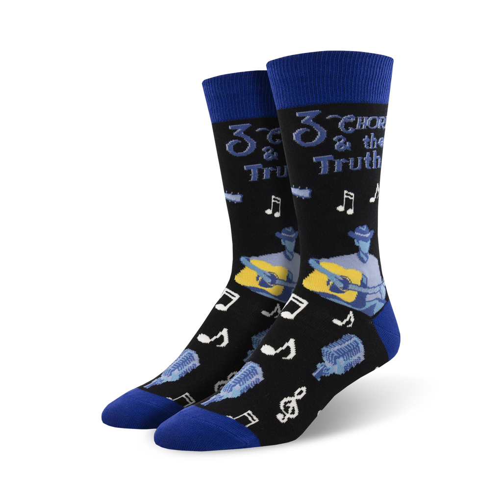 Sock it to 'em with these Crew length Men's 3 Chords & The Truth socks! Blast those Blue Suede Shoes and Strummin' On Herd 'cause these rockin' socks feature black with a blue cuff & toe, a jazzy musical note pattern, the words '3 Chords & The Truth', and a cowboy pickin' a guitar. Sock-a-Billy!