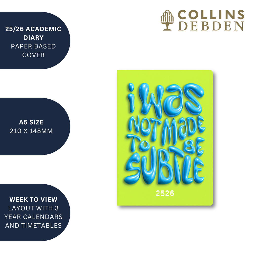 This design features a bold affirmation of 'I was not made to be subtle'. This eye-catching and motivational planner is the perfect addition to your organisational toolkit. With many useful features, choose this A5 diary to help you make the most of the upcoming academic year.