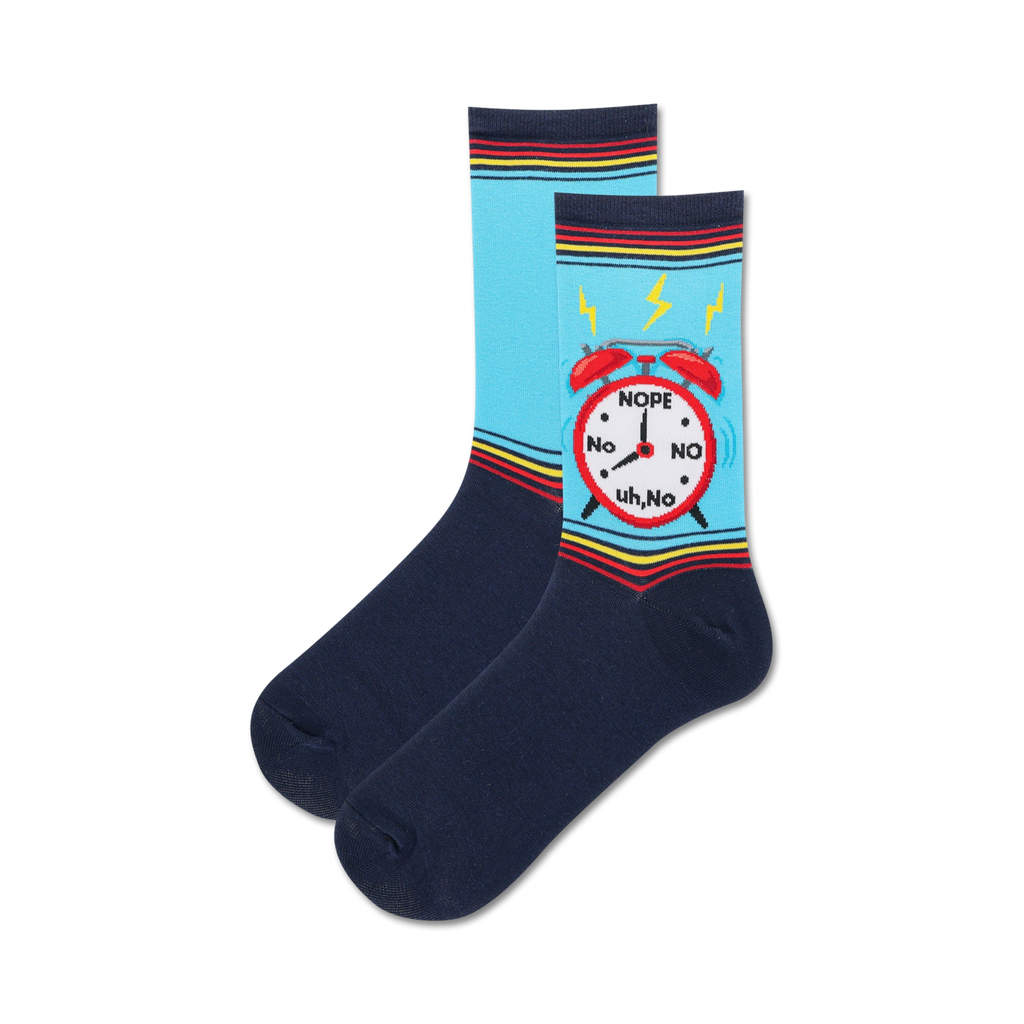 Shout a resounding “Nope!” to the morning alarm with these sassy blue crew socks. Adorned with ringing alarm clocks, complete with red bells and urgent yellow lightning bolts, these socks tell the world you're not having it today. The hands of each clock defiantly point to your mood manifesto: “No,” “Nope,” “Uh Uh.” Slip into these and let your feet do the talking when the early hours are calling.