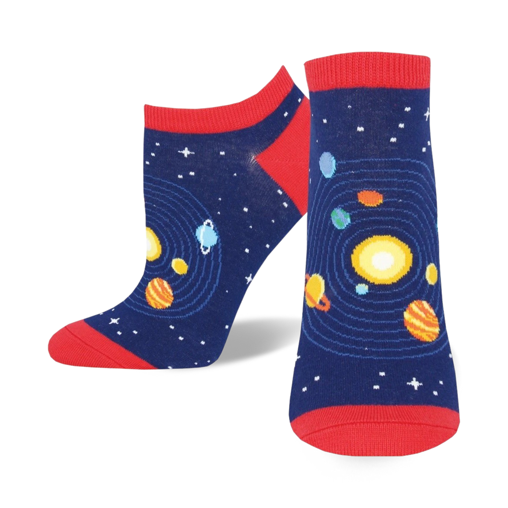 Blast off with our 'All Systems Go' socks! These ankle socks are a deep navy blue, sprinkled with little white stars and featuring a colorful solar system design. The planets orbit a bright yellow sun, all neatly arranged within swirling lines. The visible portion shows a red cuff at the top. They're comfy, fun, and perfect for anyone who appreciates a little cosmic flair in their footwear.