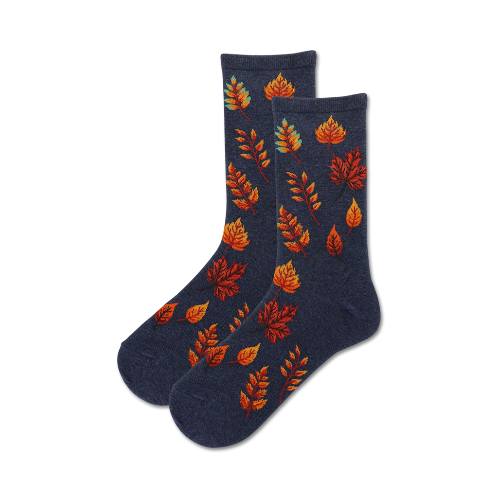 Perfect for those who like their style seasonal and their feet snug, these socks feature a crisp, leafy tableau that’ll have you practically hearing the crunch of fall foliage with every step. Swirling in a kaleidoscope of orange, red, yellow, and teal, these cozy foot wrappers turn any walk into a parade through a forest in peak autumn. And yes, they're set against a navy blue backdrop, making the vibrant colors pop like the perfect Instagram filter for your feet. Who needs to jump in a pile of leaves when you can wear one?